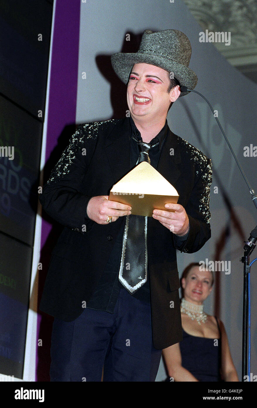 80er Jahre Ikone Boy George Ehemaliger Sanger Der Band Culture Club Grinst Als Er Eine Auszeichnung Bei Den Sony Radio Awards Im Grosvenor House Hotel In London Uberreicht Stockfotografie Alamy