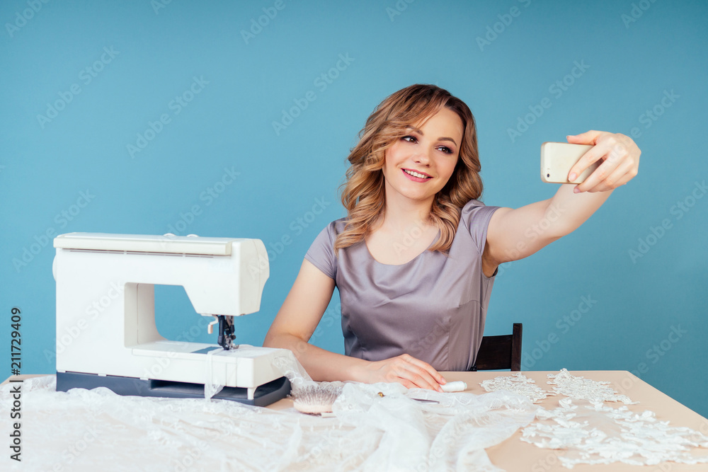 Attractive Blonde Hairstyle Girl Seamstress Tailor Dressmaker Designer Wedding Dress Making Selfie On The Phone Behind The Table With Sewing Machine On A Blue Background In The Studio Stock Photo